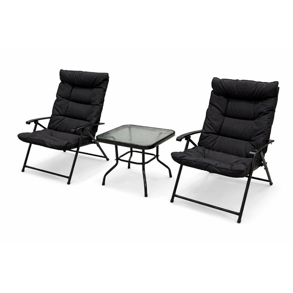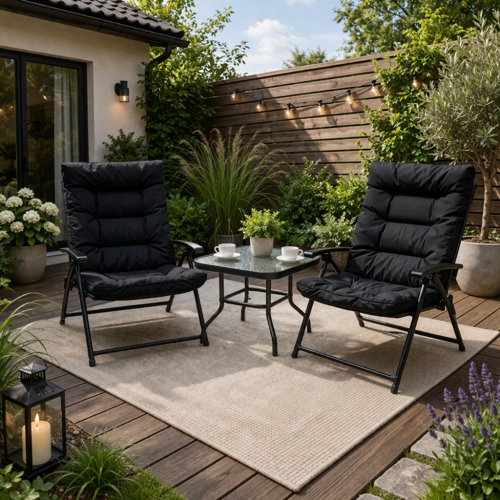 ბაღის ავეჯის კომპლექტი წარმოადგენს კომფორტულ და პრაქტიკულ გადაწყვეტას გარე და შიდა სივრცისთვის. კომპლექტი მოიცავს ორ რბილ დასაკეც სკამსა და კომპაქტურ მაგიდას, რაც იდეალურია დასვენებისთვის, ყავის დასალევად ან ყოველდღიური გამოყენებისთვის.