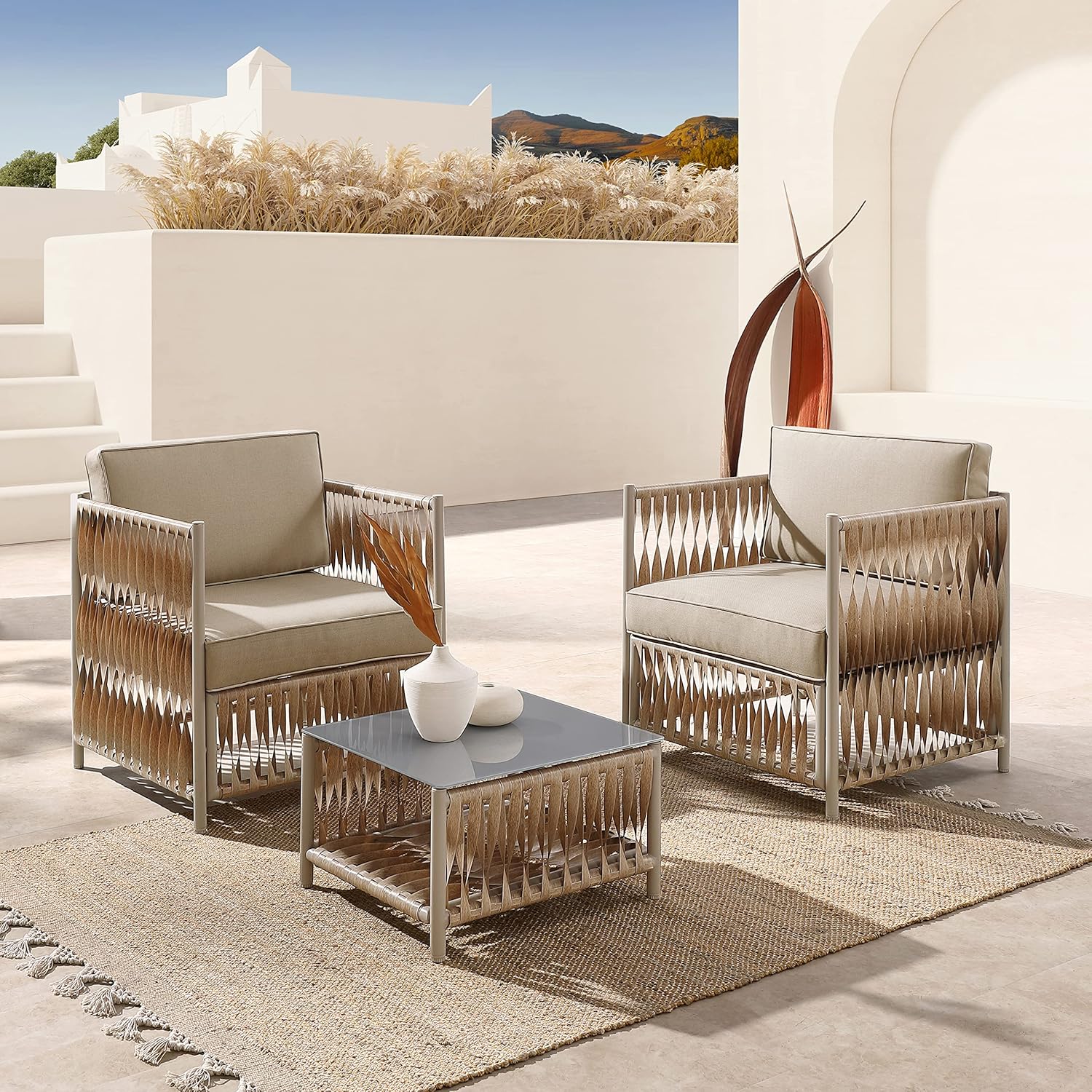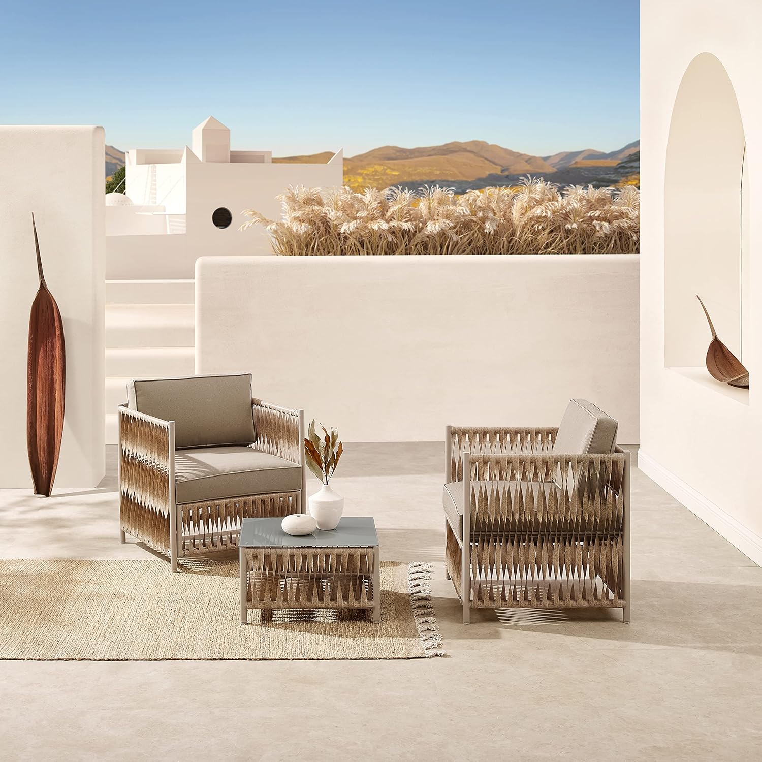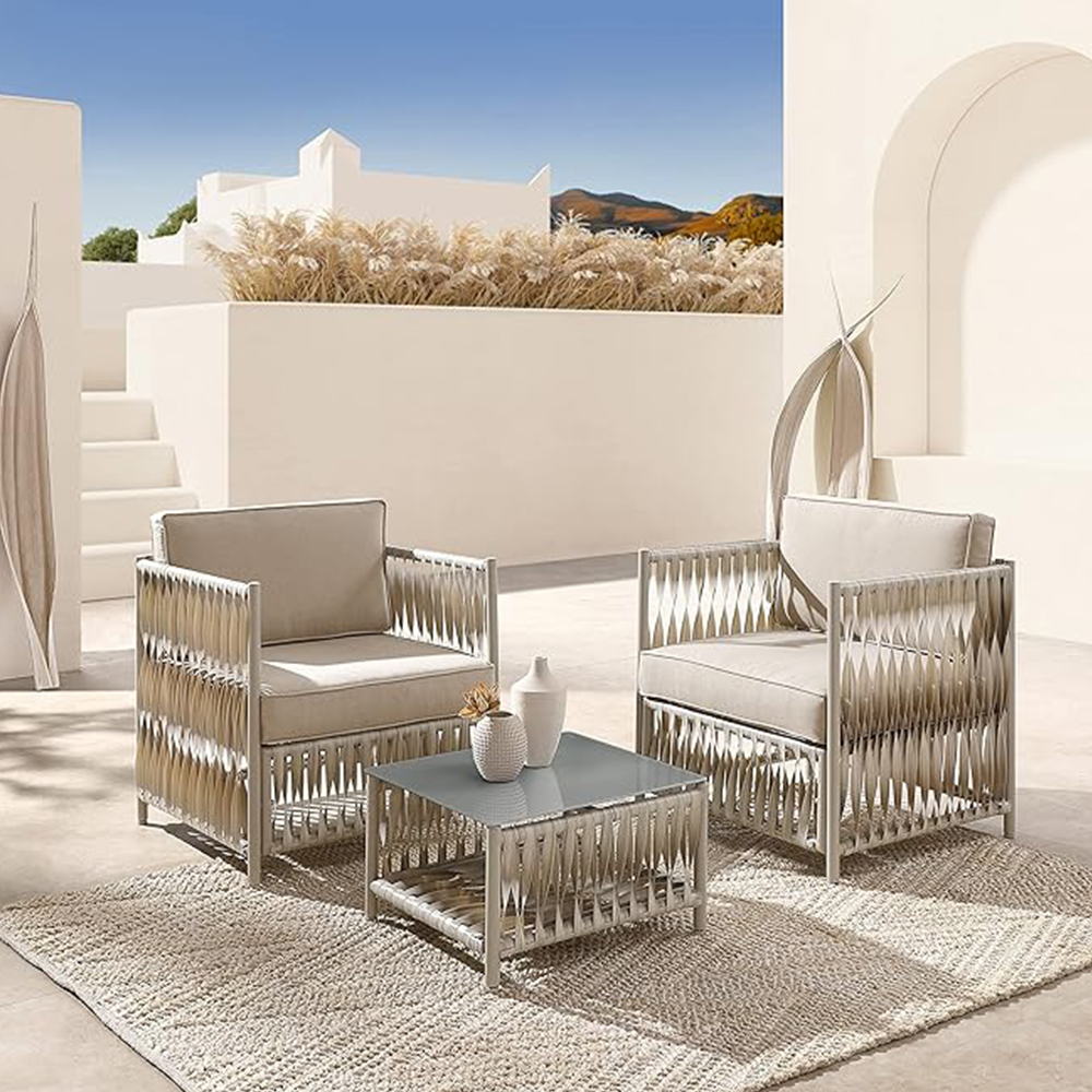 რბილი ბეჟი ფერი იდეალურად ერწყმის ბუნებრივ გარემოს და ქმნის მშვიდ, მყუდრო ატმოსფეროს. რბილი ბალიშები უზრუნველყოფენ უმაღლეს კომფორტს, რაც ხელს გიწყობთ განტვირთვისა და გარე სივრცით ტკბობას. ამინდისადმი მდგრადი მასალებისგან დამზადებული ავეჯი აერთიანებს თანამედროვე დიზაინს და გამძლეობას, რაც მას იდეალურ არჩევანად აქცევს ნებისმიერი გარე სივრცისთვის.