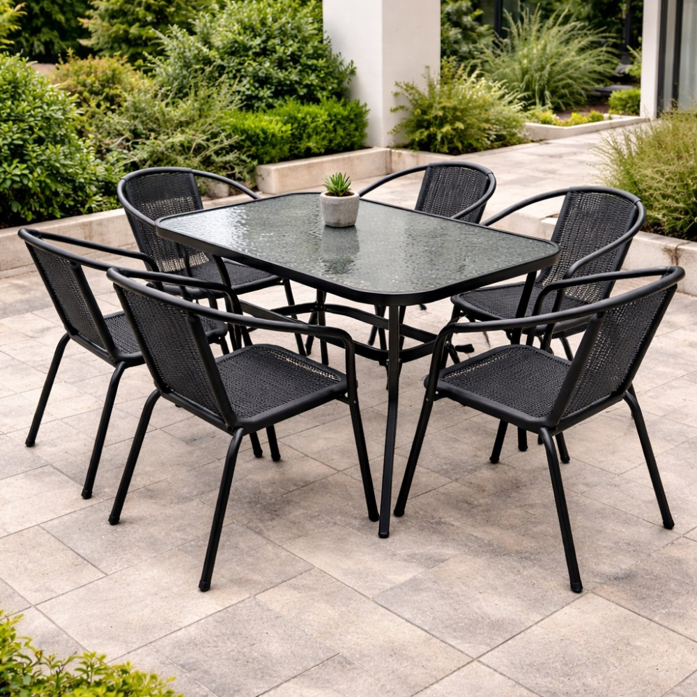 ბაღის ავეჯის კომპლექტი წარმოადგენს თანამედროვე და პრაქტიკულ გადაწყვეტას გარე სივრცის მოსაწყობად. კომპლექტი მოიცავს 1 მართკუთხა მაგიდასა და 6 კომფორტულ სკამს, რაც იდეალურია ოჯახის წევრებთან ან მეგობრებთან ერთად დროის სასიამოვნოდ გასატარებლად.