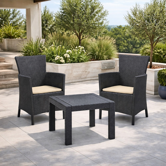 ავეჯი დამზადებულია გამძლე ხელოვნური რატანისგან, რომელიც მიბაძავს ბუნებრივ ნაქსოვს, მაგრამ აღემატება მას გამძლეობით. ეს მასალა მდგრადია ულტრაიისფერი სხივების, ტენიანობისა და ტემპერატურის ცვლილებების მიმართ, რაც უზრუნველყოფს კომპლექტის ხანგრძლივ ექსპლუატაციას ღია ცის ქვეშ. ერგონომიული სავარძლები კომფორტული მკლავურებით სასიამოვნო დასვენებას უზრუნველყოფს, ხოლო ავეჯის მცირე წონა საშუალებას იძლევა საჭიროებისამებრ მარტივად გადაადგილდეს. თავისი ელეგანტური დიზაინისა და ნაქსოვი ტექსტურის წყალობით, ეს კომპლექტი მოუხდება ნებისმიერ ექსტერიერს, რაც იდეალურ ადგილს გთავაზობთ დილის ყავისთვის, საღამოს კოქტეილებისთვის ან უბრალოდ სუფთა ჰაერზე დასვენებისთვის.