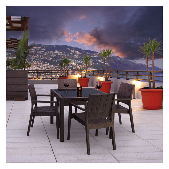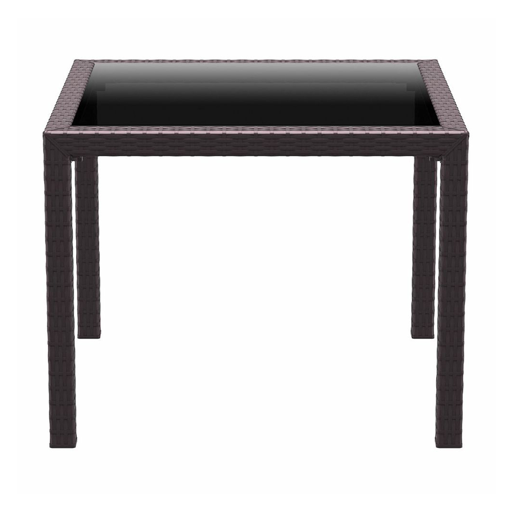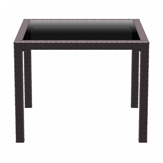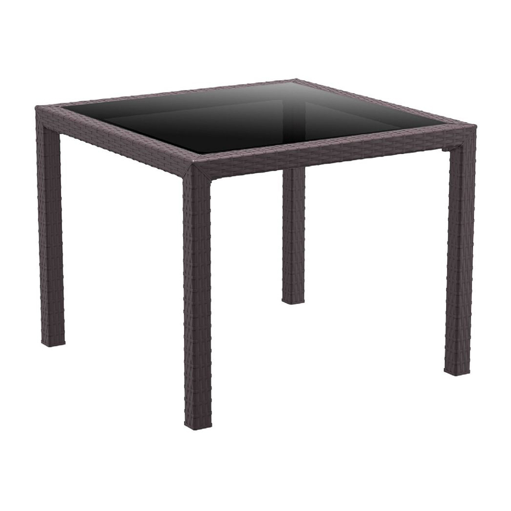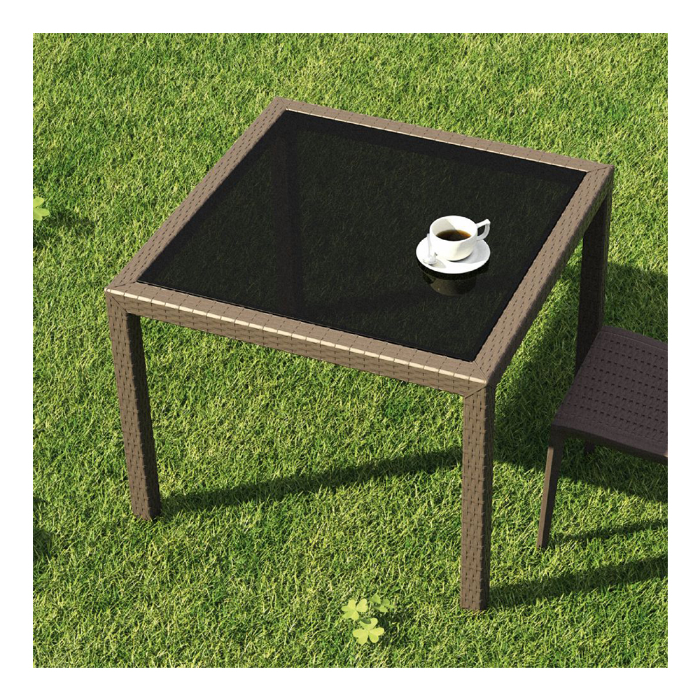 კვადრატული მაგიდა შიდა და გარე გამოყენებისთვის. მისი ზედა ნაწილი დამზადებულია 5 მმ სისქის მუქი ფერის მინისგან. მას აქვს UV დაცვა მზის სხივებისგან, რაც მას იდეალურს ხდის გარე სივრცეში გამოსაყენებლად.