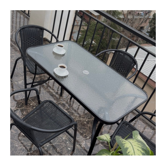 ნაწრთობი მინის მაგიდისა და მოწნული იმიტაციის,პლასტმასის სკამების კომპლექტი მეტალის კარკასით თქვენს ინტერიერსა თუ ექსტერიერს შესძენს მყუდროებას და გამორჩეულ დიზაინს. ნაკრებში შედის 1 მაგიდა, ქოლგის სამაგრით ზომით : 120*70*70 4 ცალი სკამი ზომით: 54*61*73 გამძლეობა: 120კგ