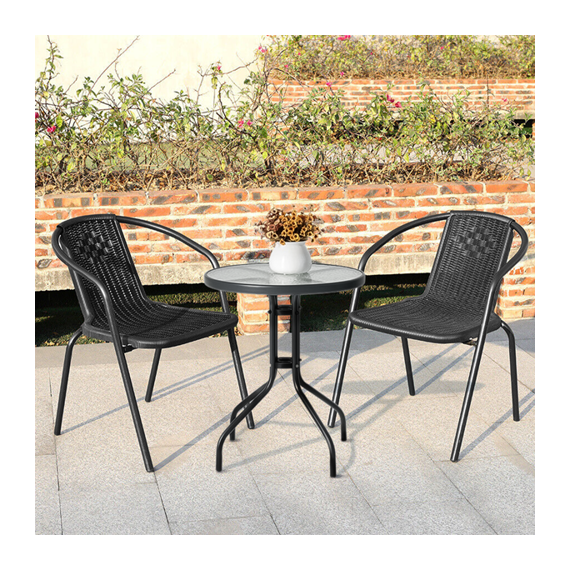 ნაწრთობი მინის მაგიდისა და მოწნული იმიტაციის,პლასტმასის სკამების კომპლექტი მეტალის კარკასით თქვენს ინტერიერსა თუ ექსტერიერს შესძენს მყუდროებას და გამორჩეულ დიზაინს.