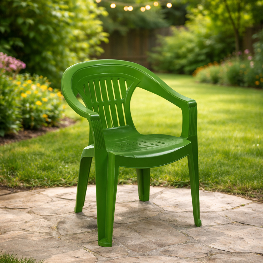 სკამი დამზადებულია გამძლე პლასტმასისგან, რომელიც მდგრადია ტენიანობის, მზის სხივებისა და ტემპერატურის ცვალებადობის მიმართ. მსუბუქი კონსტრუქცია ამარტივებს გადაადგილებას, ხოლო მყარი ფორმა უზრუნველყოფს სტაბილურობასა და უსაფრთხოებას ყოველდღიური გამოყენების დროს. ერგონომიული საზურგე და მკლავები ზრდის კომფორტს და სკამს ხდის მოსახერხებელს როგორც დასვენებისთვის, ისე ხანგრძლივი ჯდომისთვის.