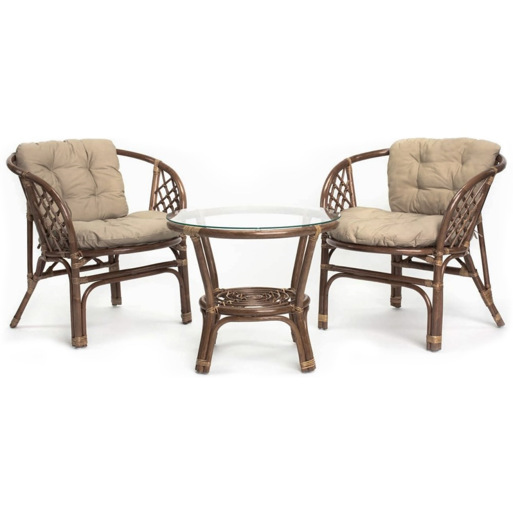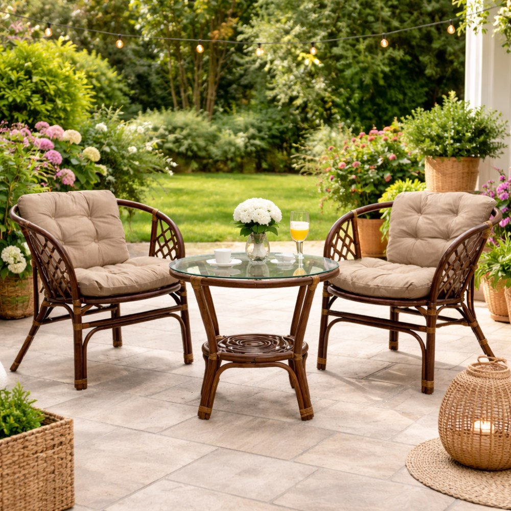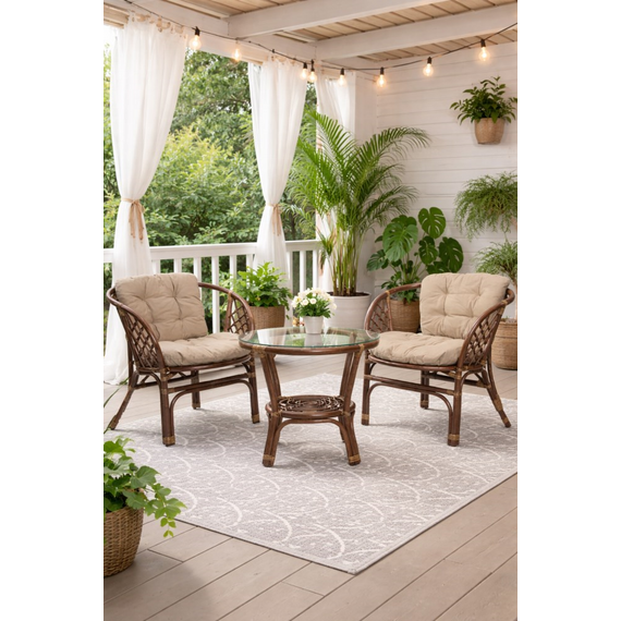 ავეჯი არის დამზადებული მაღალი ხარისხის რატანისა და ელეგანტური მინის კომბინაციით, რაც უზრუნველყოფს მის ხანგრძლივობას და მდგრადობას სხვადასხვა ამინდის პირობების მიმართ. მისი მიმზიდველი დიზაინი, რომელიც ბუნებრივ ნაქსოვს ბაძავს, და გააზრებული ზომები საშუალებას აძლევს ამ კომპლექტს ჰარმონიულად შეერწყას ნებისმიერ ექსტერიერს. ის ქმნის იდეალურ ადგილს დილის ყავისთვის, საღამოს საუბრებისთვის ან უბრალოდ სუფთა ჰაერზე დასვენებისთვის.