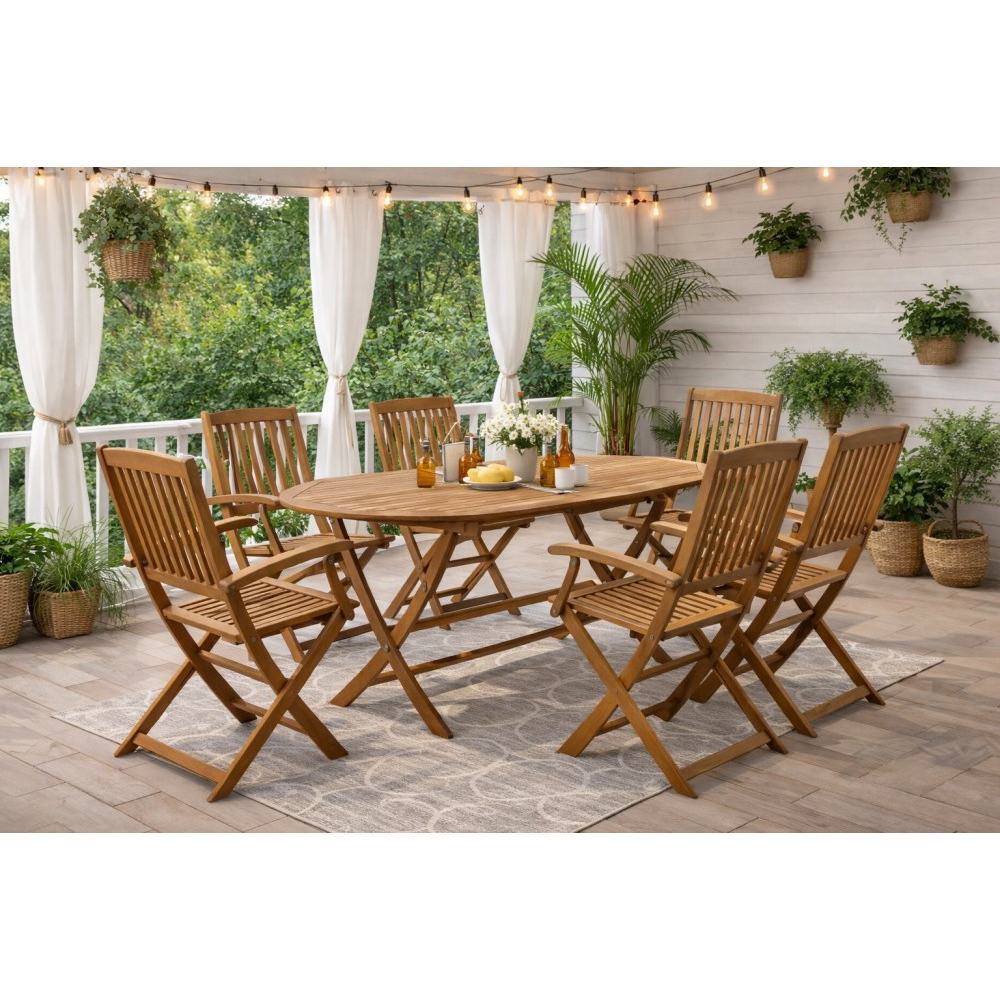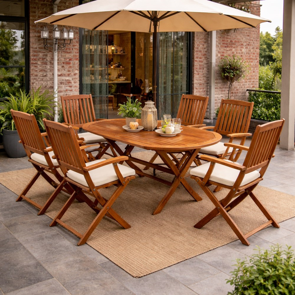 კომპლექტში ასევე შედის ექვსი ელეგანტური და კომფორტული სკამი. თითოეული სკამის ზომებია: სიგანე 58 სმ, სიღრმე 52 სმ და სიმაღლე 91 სმ, რაც კომფორტულ დასაჯდომს უზრუნველყოფს. ერგონომიული საზურგე და მოსახერხებელი სახელურები საშუალებას გაძლევთ მოდუნდეთ და დატკბეთ დასვენებით. სკამები ასევე აკაციის ხისგანაა დამზადებული და აქვთ პრაქტიკული დასაკეცი კონსტრუქცია, ადვილად ინახება და ზოგავს ადგილს. საზურგის დიზაინი არა მხოლოდ ელეგანტურად გამოიყურება, არამედ კარგ ვენტილაციასაც უზრუნველყოფს.