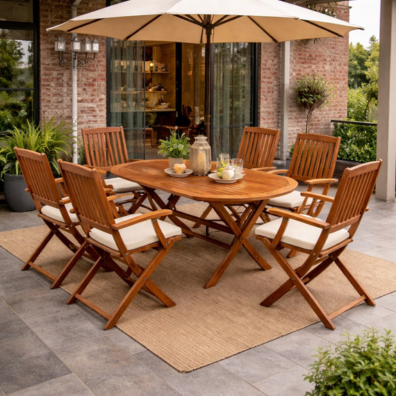 კომპლექტის ცენტრალური ელემენტია ოვალური მაგიდა ფართო ზედაპირით, რომლის ზომებია: სიგრძე 160 სმ, სიგანე 85 სმ და სტანდარტული სიმაღლე 74 სმ. მისი დიზაინი ზედმიწევნითაა გააზრებული: მდგრადი ფეხები საიმედოობას უზრუნველყოფს, ხოლო გლუვი ზედაპირი სასიამოვნოა შეხებით და ადვილი მოსავლელია. სურათიდან გამომდინარე, მაგიდას შესაძლოა ჰქონდეს მოსახერხებელი დასაკეცი მექანიზმი ან შედგებოდეს ორი ნაწილისგან, რაც ამარტივებს მის ტრანსპორტირებასა და სეზონსგარეშე შენახვას. მაგიდის ცენტრში გათვალისწინებულია ქოლგის დასამაგრებელი ხვრელი, რაც მზიან დღესაც კი საშუალებას მოგცემთ დატკბეთ გარეთ დასვენებით.