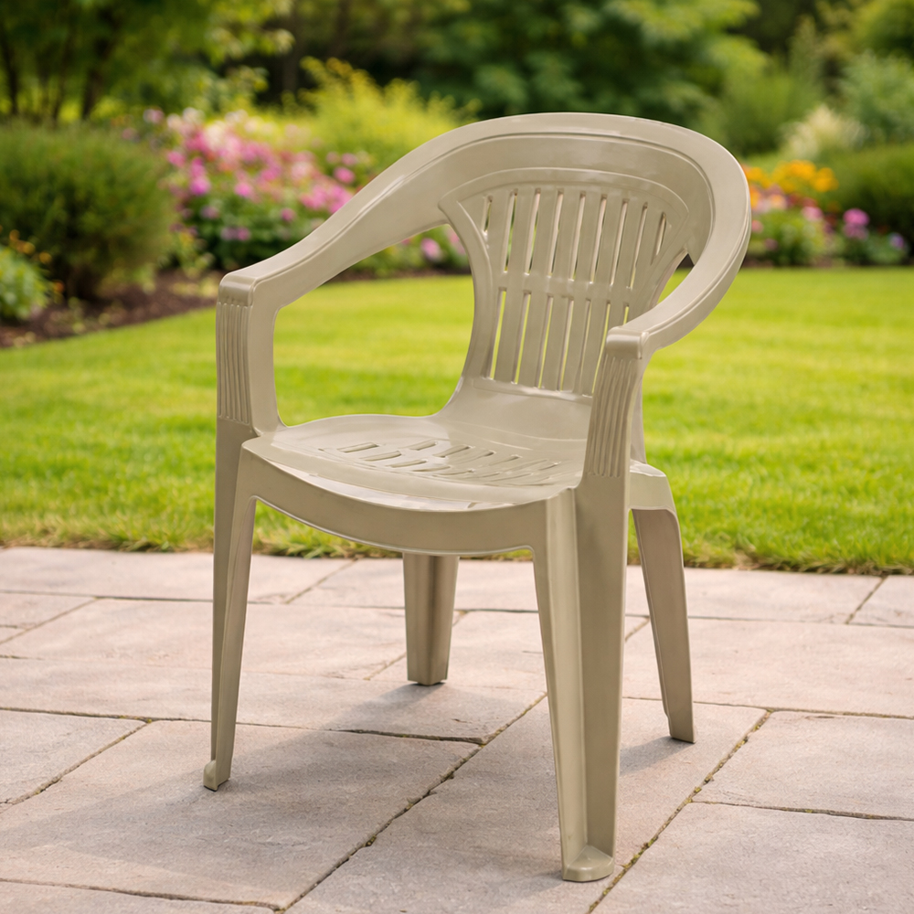 სკამი დამზადებულია გამძლე პლასტმასისგან, რომელიც მდგრადია ტენიანობის, მზის სხივებისა და ტემპერატურის ცვალებადობის მიმართ. მსუბუქი კონსტრუქცია ამარტივებს გადაადგილებას, ხოლო მყარი ფორმა უზრუნველყოფს სტაბილურობასა და უსაფრთხოებას ყოველდღიური გამოყენების დროს. ერგონომიული საზურგე და მკლავები ზრდის კომფორტს და სკამს ხდის მოსახერხებელს როგორც დასვენებისთვის, ისე ხანგრძლივი ჯდომისთვის.