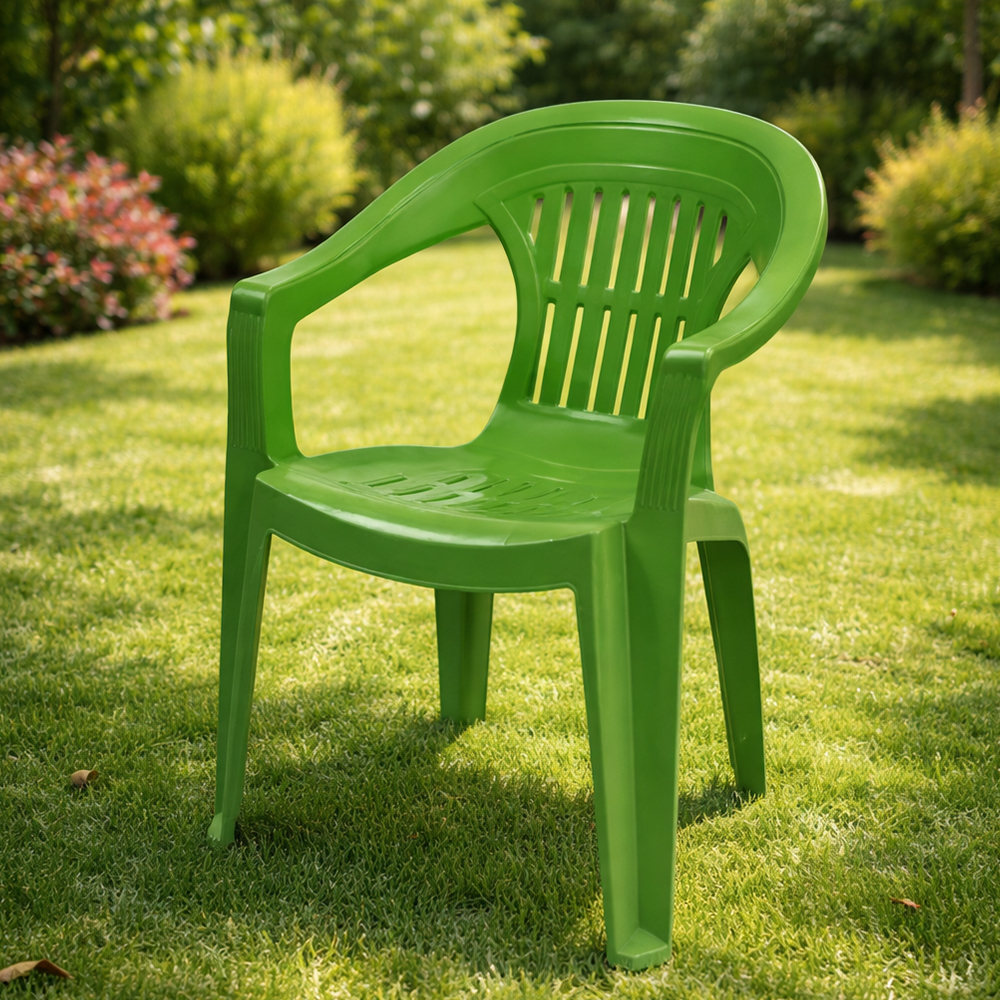 სკამი დამზადებულია გამძლე პლასტმასისგან, რომელიც მდგრადია ტენიანობის, მზის სხივებისა და ტემპერატურის ცვალებადობის მიმართ. მსუბუქი კონსტრუქცია ამარტივებს გადაადგილებას, ხოლო მყარი ფორმა უზრუნველყოფს სტაბილურობასა და უსაფრთხოებას ყოველდღიური გამოყენების დროს. ერგონომიული საზურგე და მკლავები ზრდის კომფორტს და სკამს ხდის მოსახერხებელს როგორც დასვენებისთვის, ისე ხანგრძლივი ჯდომისთვის.