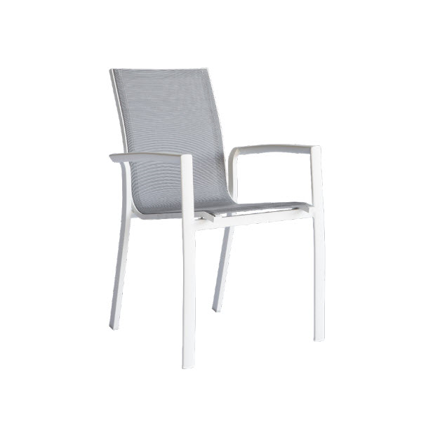 ეს ბაღის სკამი გამოირჩევა მსუბუქი, მაგრამ მტკიცე კონსტრუქციით და თანამედროვე, მინიმალისტური დიზაინით. ალუმინის კარკასი უზრუნველყოფს გამძლეობასა და კოროზიის მიმართ მდგრადობას, რაც მას იდეალურს ხდის გარე გამოყენებისთვის. ტექსტილის ზედაპირი კომფორტულია დასაჯდომად, უზრუნველყოფს ჰაერგამტარობას და მარტივად იწმინდება.