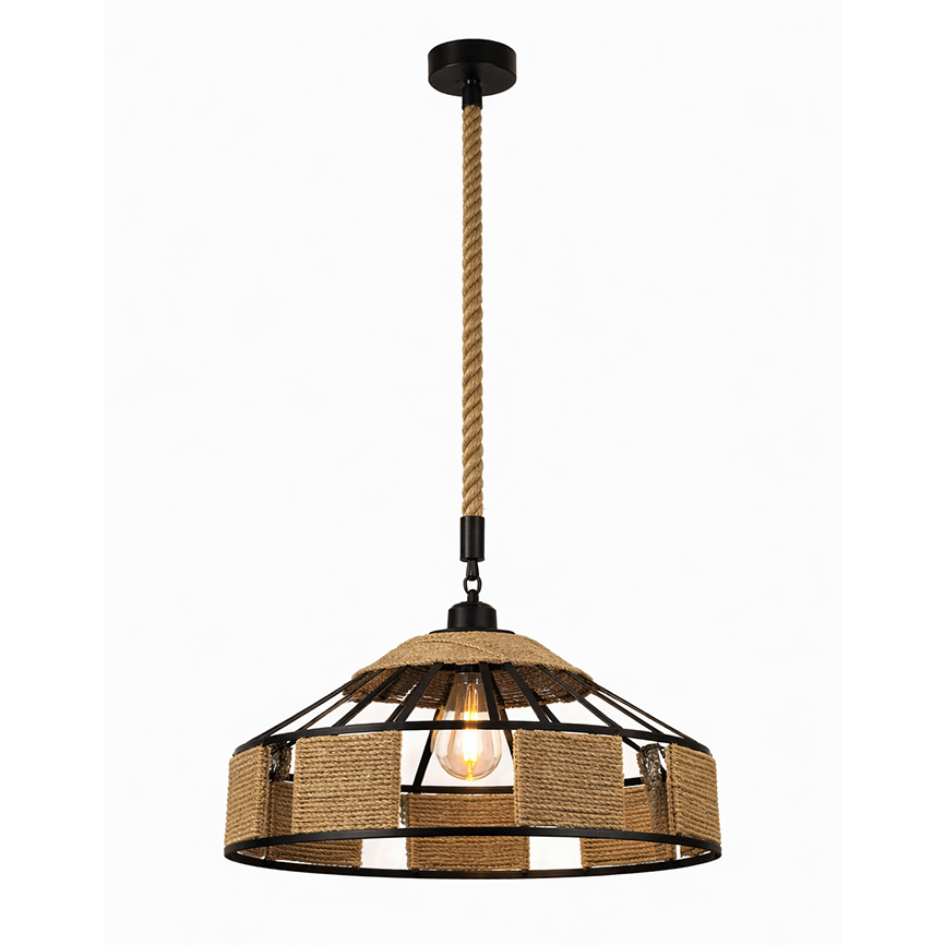 დახვეწილი საკიდი სანათი აერთიანებს ინდუსტრიულ სტილსა და ბუნებრივი მასალების თბილ ესთეტიკას. შავი მეტალის გეომეტრიული კონსტრუქცია შემოსილია ბოჭკოს დეკორატიული სარტყლებით, რაც ქმნის ორიგინალურ ვიზუალურ ეფექტს და ანაწილებს სინათლეს რბილად და თანაბრად.