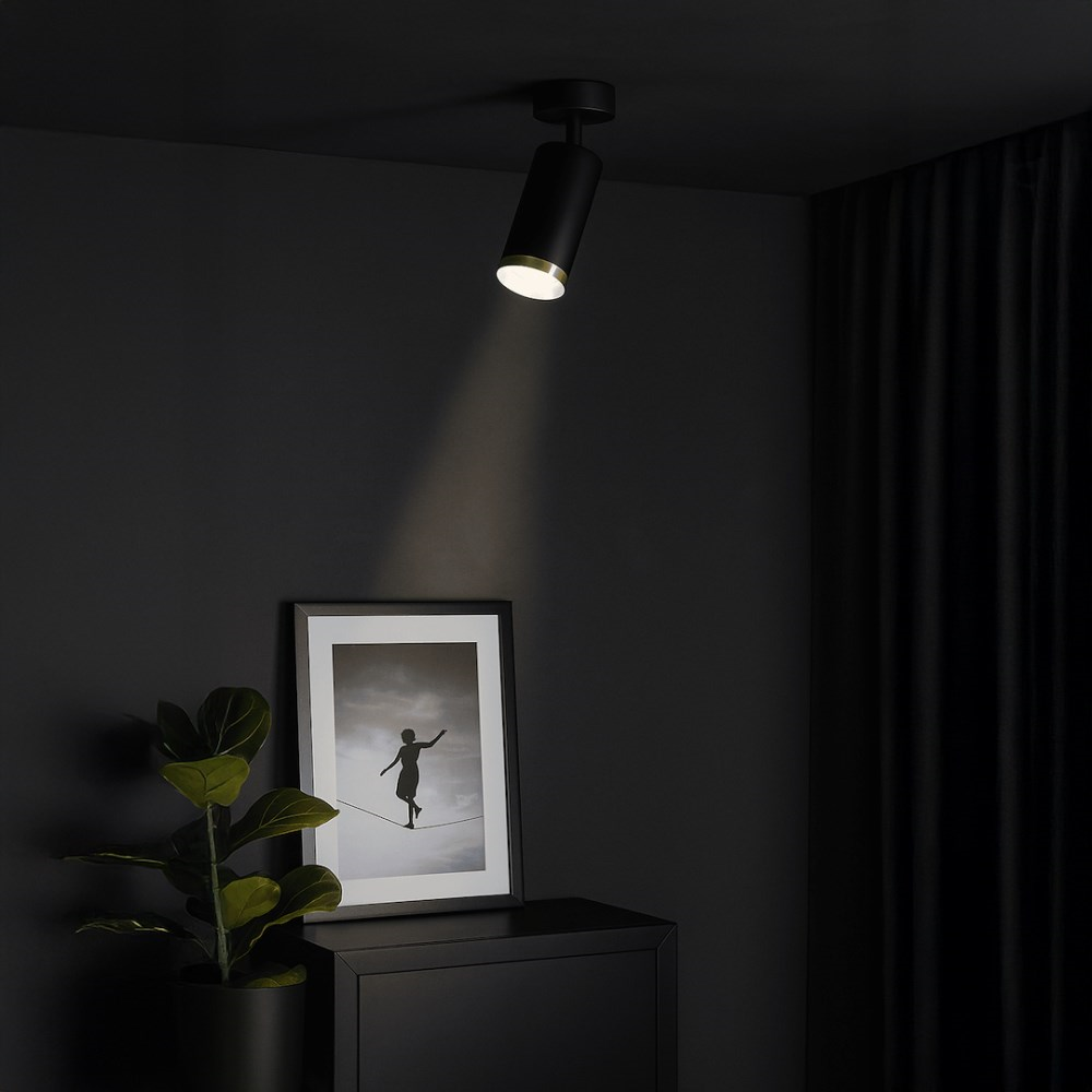 მინიმალისტური და თანამედროვე დიზაინის სპოტ სანათი, რომელიც იდეალურად ერგება როგორც ბინას, ისე კომერციულ სივრცეებს. მბრუნავი მექანიზმი საშუალებას იძლევა განათება მიმართოთ სასურველი მიმართულებით. გამძლე მეტალის კორპუსი და ოქროსფერი, შავი მატური საფარი ქმნის ელეგანტურ იერს.
