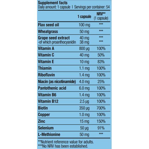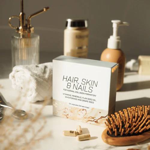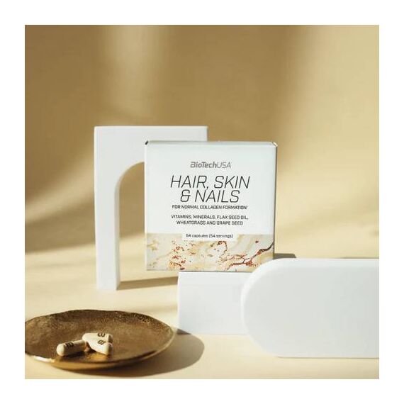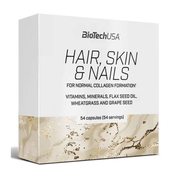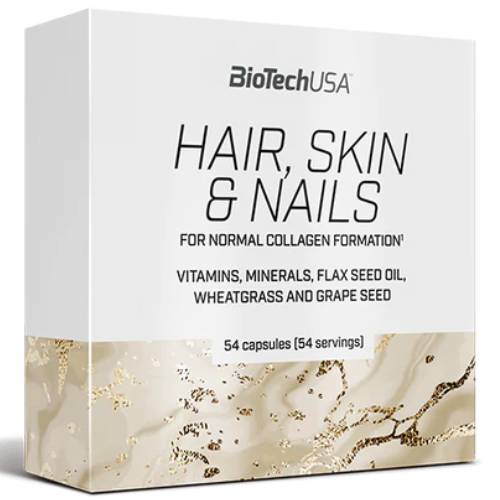 BioTech USA Hair, Skin & Nails ეს არის საკვები დანამატი სპეციალურად შექმნილი: თქვენი თმის, კანისა და ფრჩხილების სიჯანსაღისთვის. Hair, Skin & Nails (თმა, კანი და ფრჩხილები) აერთიანებს 10-მდე სახის ვიტამინს და 3 სახის მინერალს, მათ შორის ორგანულ სპილენძსა და თუთიას, ბუნებრივ ინგრედიენტებთან, როგორიცაა სელის ზეთი, ხორბლის ბალახი და ყურძნის თესლის ექსტრაქტი.