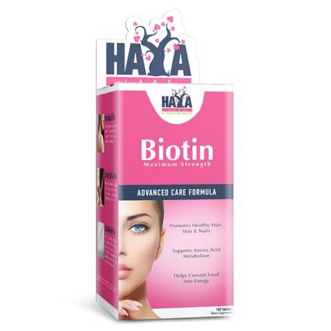 კომპანია Haya Labs-ის Biotin (ბიოტინი) ხელს უწყობს: იმუნიტეტის გაძლიერებას, ნივთიერებათა ცვლის დარეგულირებას, ჭარბი წონის კლებას და ასრულებს მნიშვნელოვან როლს კანის გაჯანსაღება-გაახალგაზრდავებაში. ბიოტინი ერთ-ერთი ყველაზე მნიშვნელოვანი ვიტამინია ზრდისა და თმის ფოლიკულის განვითარებისათვის. ის განაპირობებს ბუნებრივი რეგენერაციული პროცესების მიმდინარეობას თმის ძირებში. ბიოტინი აღადგენს და აძლიერებს ფრჩხილების სტრუქტურას, უბრუნებს მათ ბუნებრივ შეფერილობას და ხელს უწყობს ზრდის პროცესს. ეს ვიტამინი ასევე უზრუნველყოფს კანის კვებას, დატენიანებას, ხელს უშლის ნაოჭების წარმოქმნას და უკვე ფორმირებულის შემდგომ განვითარებას.
