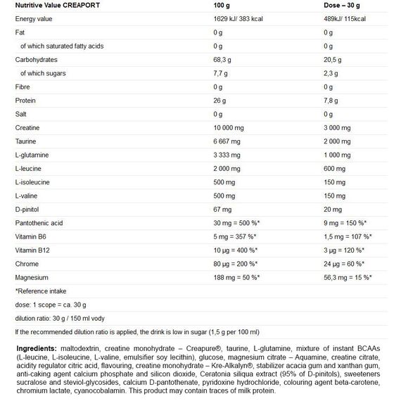 CREAPORT წარმოადგენს: კრეატინებს შორის უდავოდ ლიდერ პროდუქტს, რომელიც შეიცავს კრეატინის სამ განსხვავებულ ფორმას და გაძლიერებულია ტაურინით, გლუტამინით, BCAA ამინომჟვებითა და ვიტამინების ოპტიმალური დოზებით.