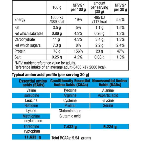 თვითოეული პორცია შეიცავს: 5.5 გრამზე მეტ BCAA ამინომჟავებს