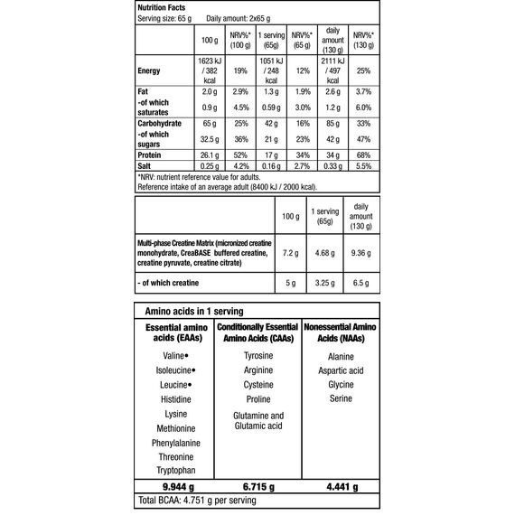 Hyper Mass 5000 BioTech-ის შემადგენლობა ერთ პორციაში: (65 გ.)