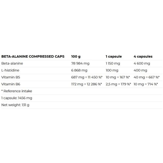 BETA-ALANIN COMPRESSED CAPS: არის მაღალი ხარისხის ბეტა ალანინს ჟელატინის კაფსულები, რომლებიც ადვილად აითვისება ორგანიზმის მიერ და შეიცავს აქტიური ინგრედიენტების ზუსტ რაოდენობას: ამინომჟავებს ბეტა-ალანინს და L-ჰისტიდინს.