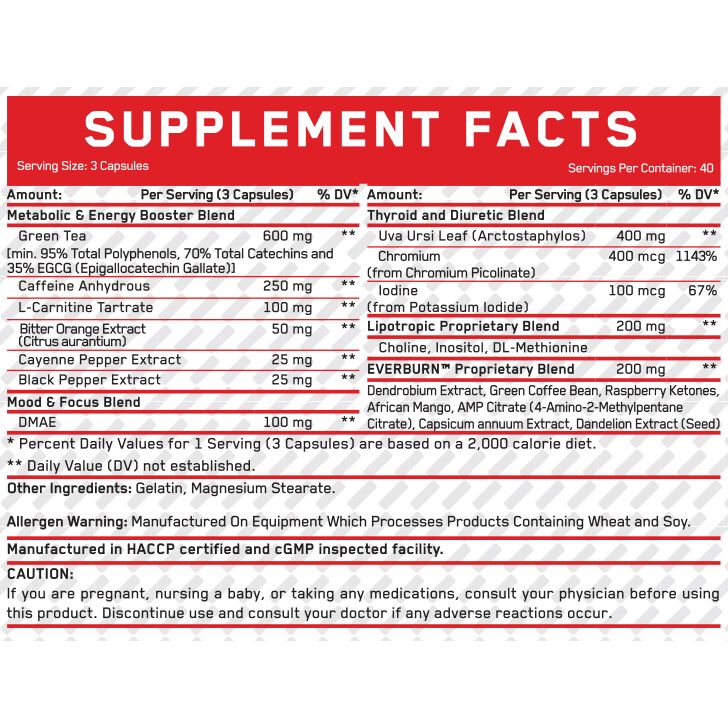 EverBurn-ის კომპლექტში შემავალი: ლ-კარნიტინის ტარტრატი არის ამინომჟავის L-კარნიტინის ერთ-ერთი უმაღლესი ხარისხის ფორმა, რომელიც პასუხისმგებელია ცხიმოვანი მჟავების ტრანსპორტირებაზე კუნთოვანი უჯრედების მიტოქონდრიაში, სადაც ისინი წარმოიქმნებიან როგორც ენერგია. კოფეინი სინერგიულად ზრდის ენერგიის გამომუშავებას და ცხიმოვან მჟავებს, რომლებიც გამოიყოფა სისხლში სხეულის ცხიმებიდან. შავი და წითელი წიწაკის და მწარე ფორთოხლის ექსტრაქტებთან ერთად მათ აქვთ ძლიერი თერმოგენული მოქმედება სხეულზე. დაპატენტებული ფორმულა 12 HOURS ENERGY BURST უზრუნველყოფს დამატებითი ენერგიის შეუჩერებელ მიწოდებას მიღებიდან 12 საათის განმავლობაში.