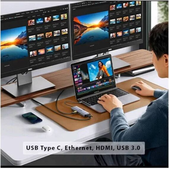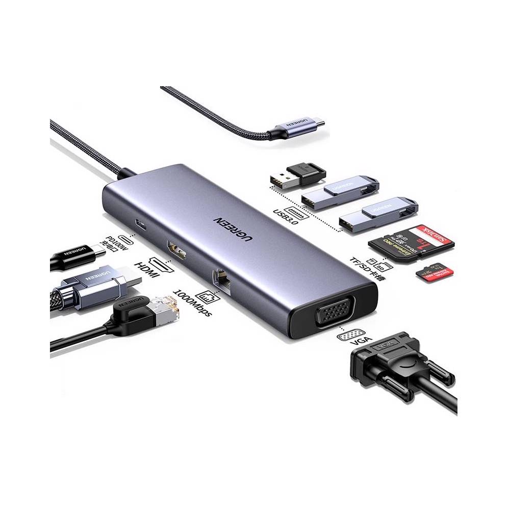 USB-C ჰაბი UGREEN CM498 (15600), Type-C, USB, HDMI, VGA, RJ45, SD, TF, Hub, Gray