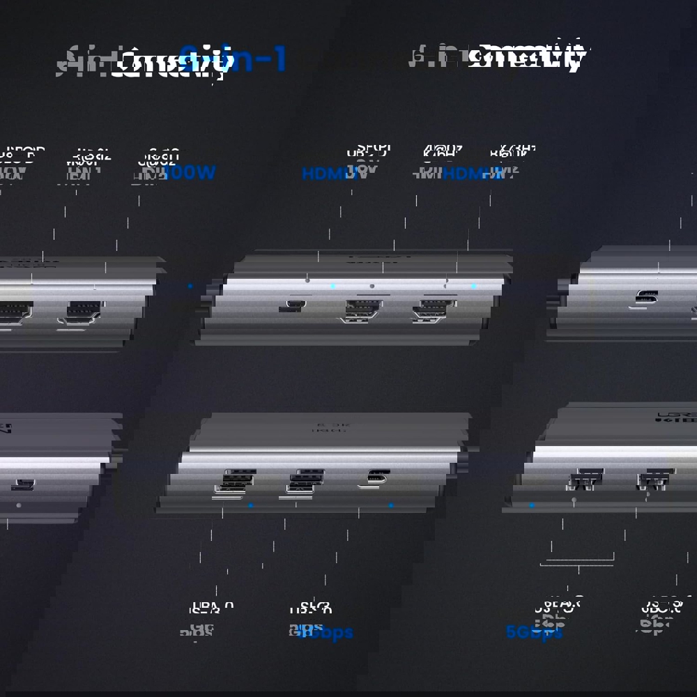 USB-C ჰაბი UGREEN CM498 (15852) Revodok 206, 2xHDMI, USB, Type-C, HUB, Grey
