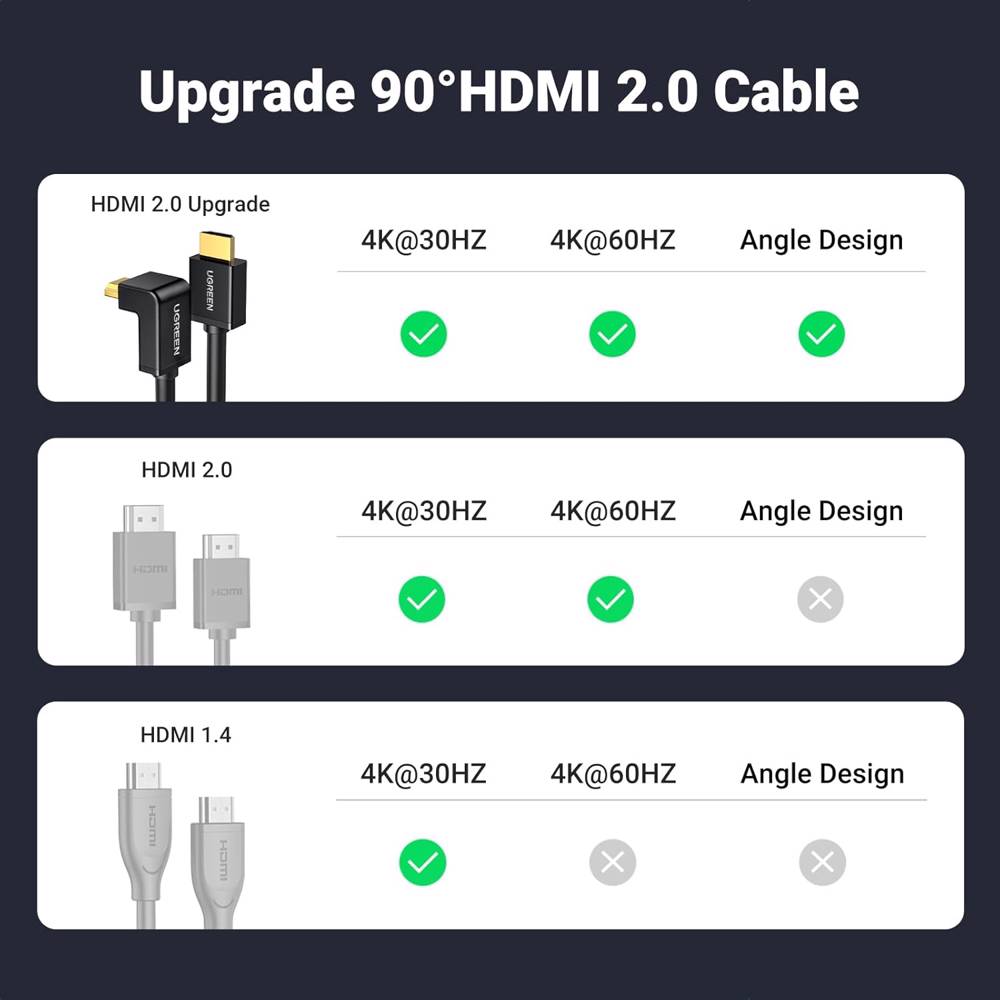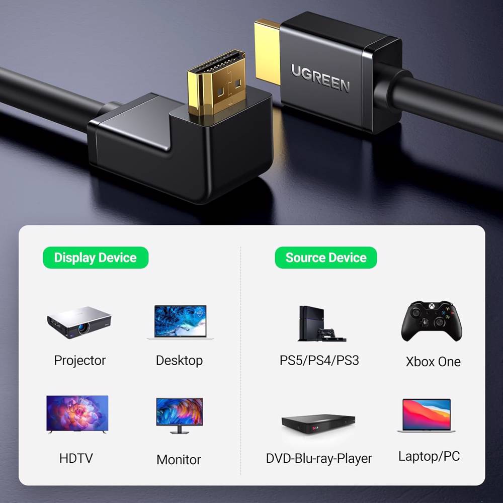 HDMI კაბელი UGREEN HD103 (10172), 4K HDMI Cable Male to Male, 90 Degree, 1m, Black