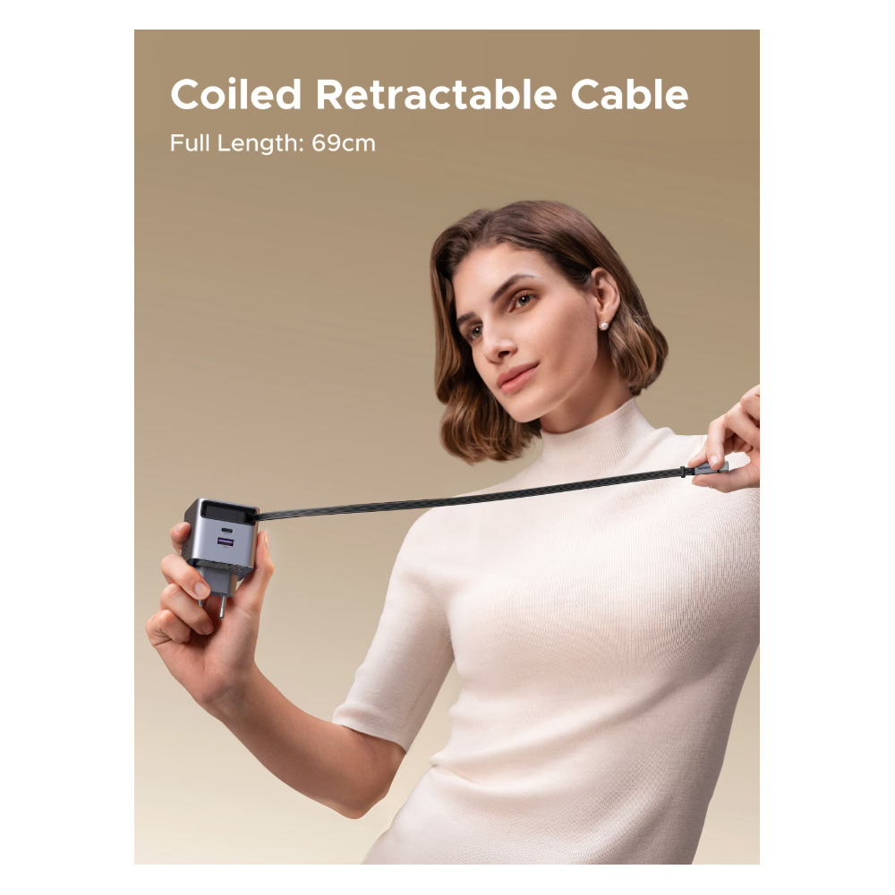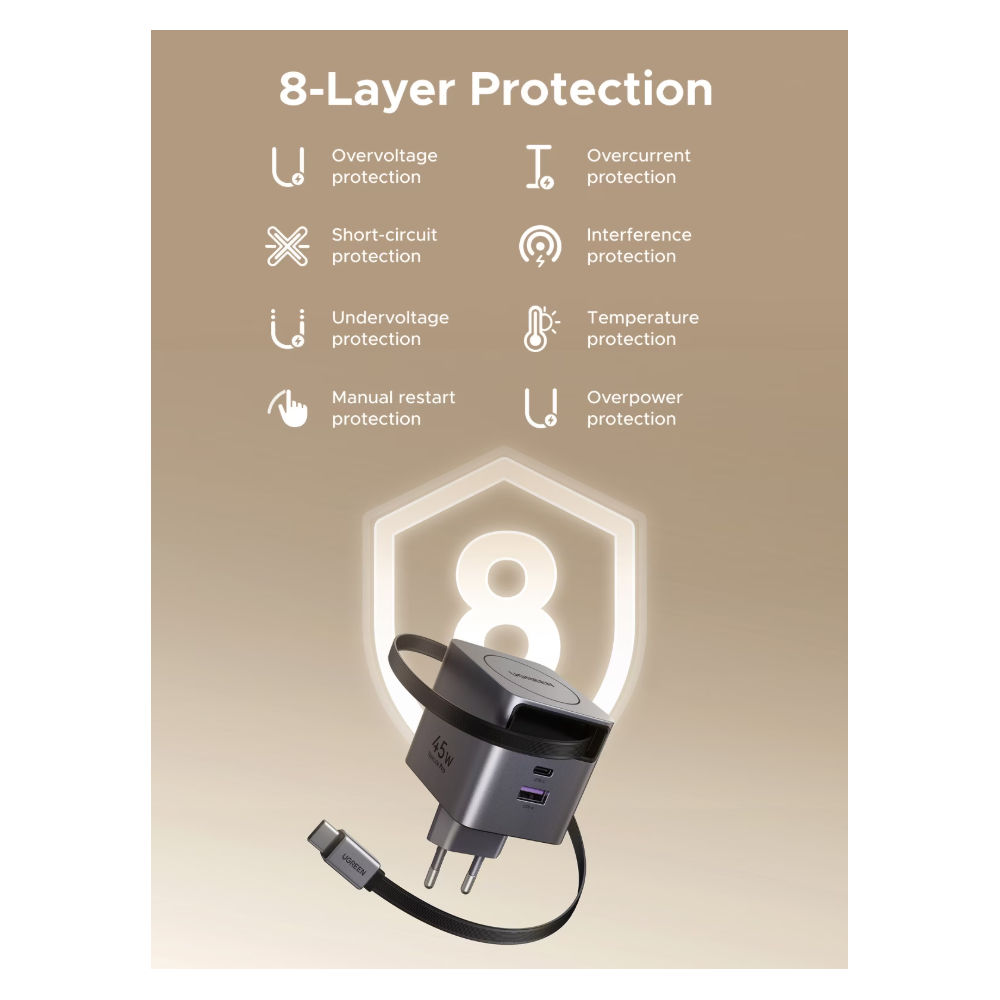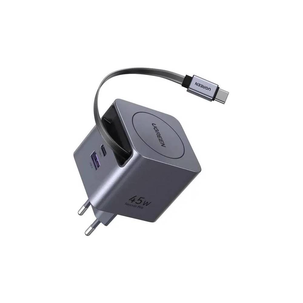 მობილურის დამტენი UGREEN X614 (65822), 45W, Type-C, USB, GaN Fast Charger With Retractable Cable, Grey