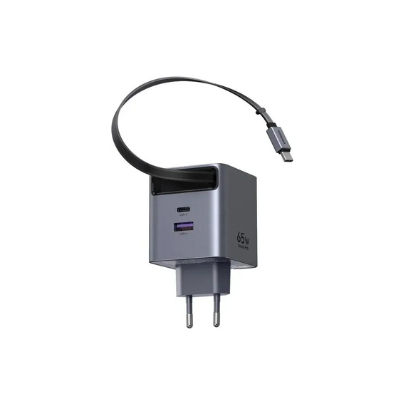 მობილურის დამტენი UGREEN X615 (65825), 65W, Type-C, USB, GaN Fast Charger With Retractable Cable, Grey