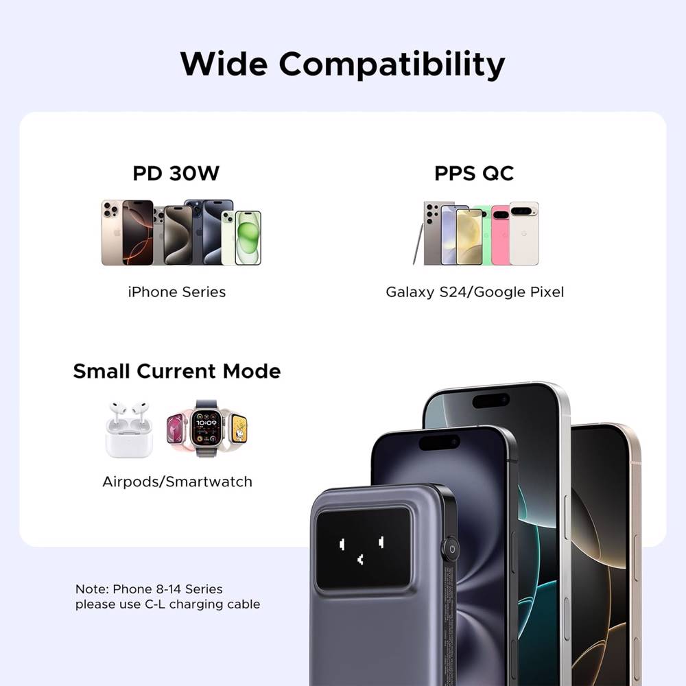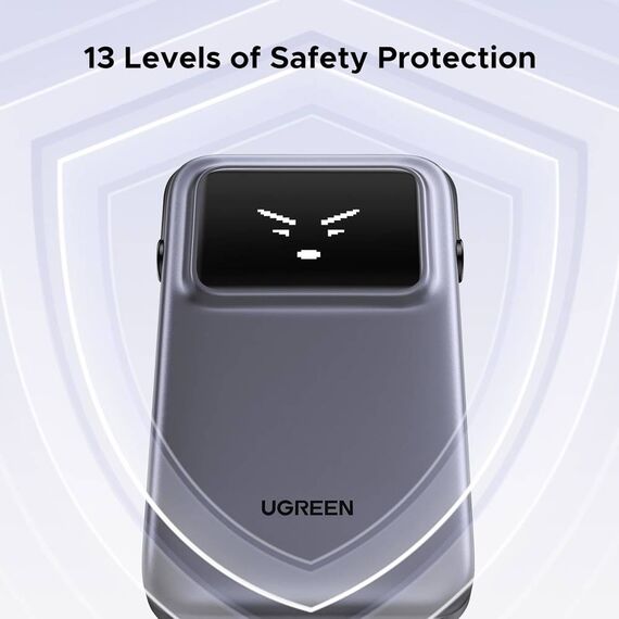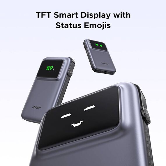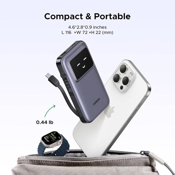 პორტატული დამტენი UGREEN PB511 (35603B) Uno, 10000mAh 30W, USB, Type-C, Power Bank With Built In Cable, Grey